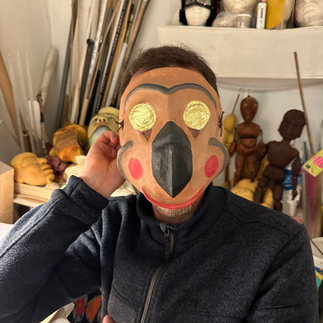 Originaire de ce territoire, Thomas porte cette mémoire.Et il a choisi de la raviver autrement. À partir d’une sculpture mêlant l’humain et l’oiseau, il a donné naissance à un masque chargé de sens. Dans ses yeux, des pièces d’or : symbole de l’ambition et de la trahison qui traversent cette légende.